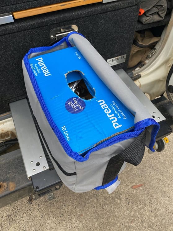 This bag is made to suit the 10L water boxes sold at Woolworths or Coles. When the cardboard gets wet the box starts to fall apart so with the bag you can protect the cardboard, easy to carry them around and also hang on different spots and get the water from the built in tap.