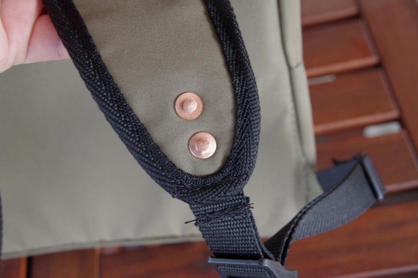 Two more copper rivets on each shoulder strap.. these rivets, you’d struggle to find any other manufactured canvas product with these hand hammered copper rivets. Great look and tough as nails.