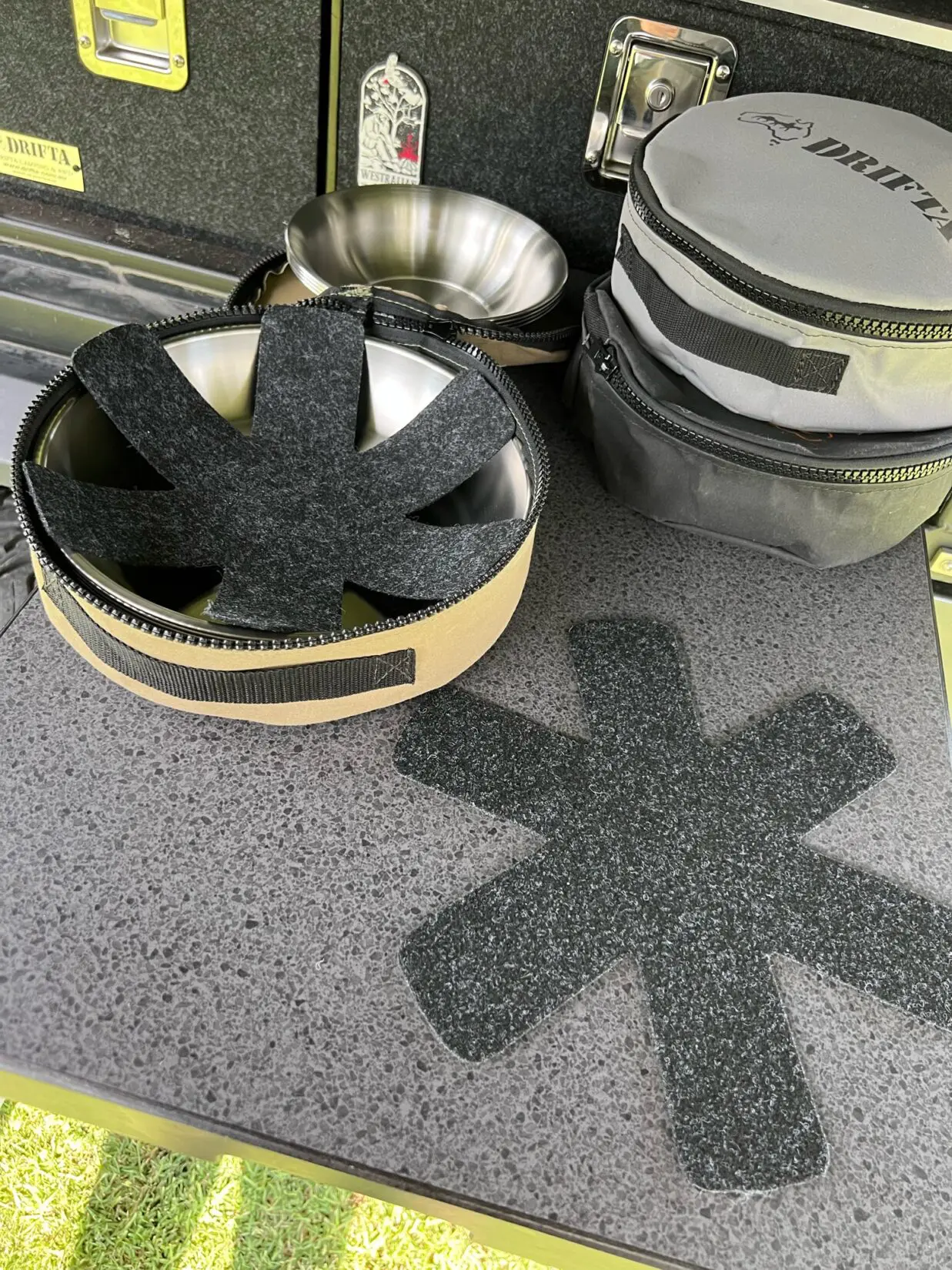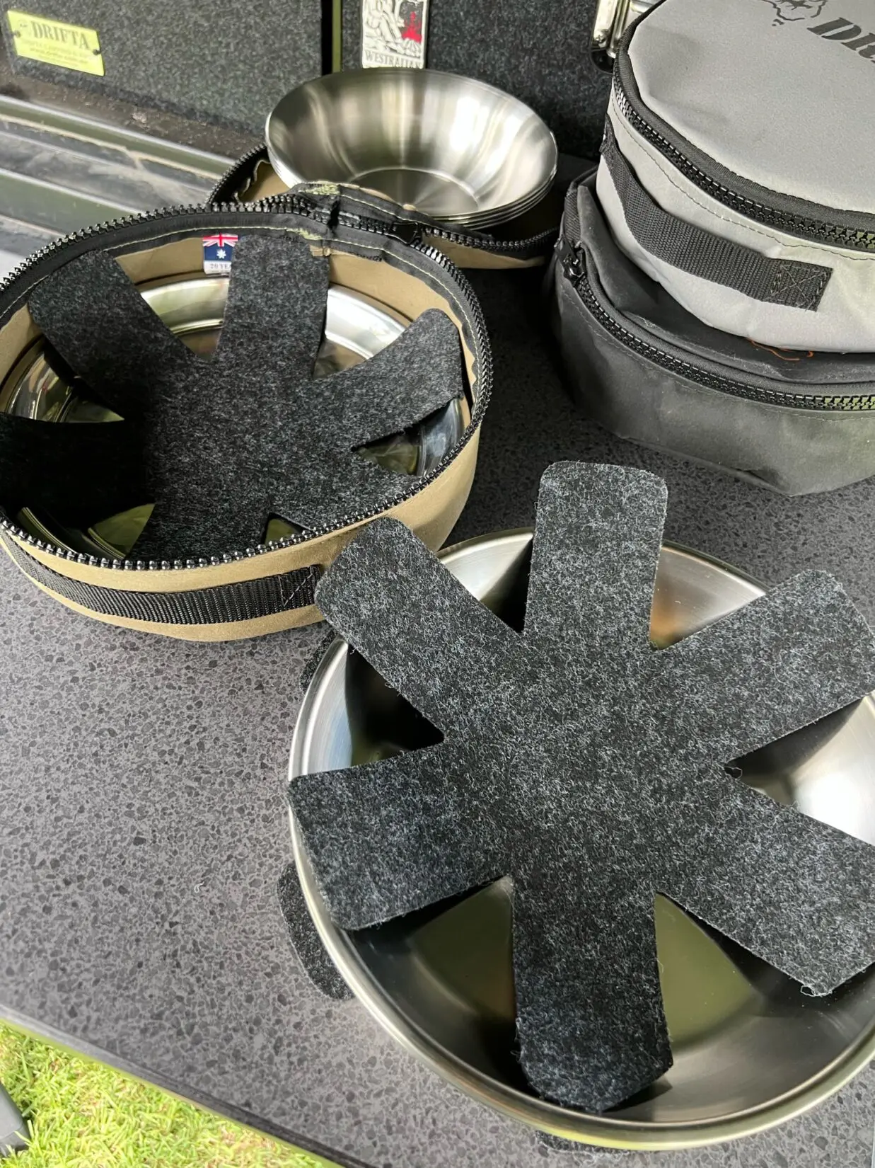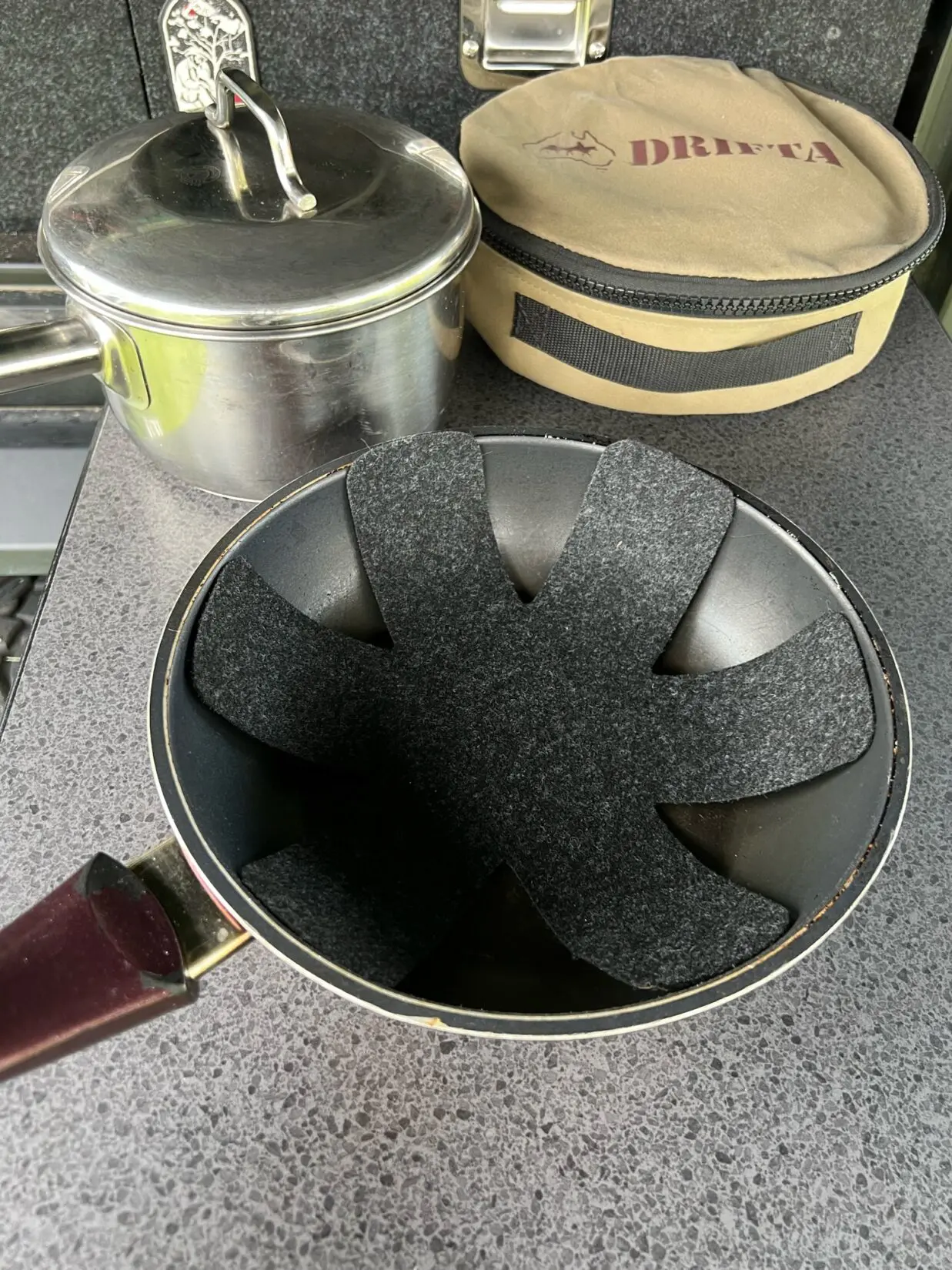 These protectors help to keep your teflon pans, plates etc from scratching and rattling. They are made from our boot liner material.