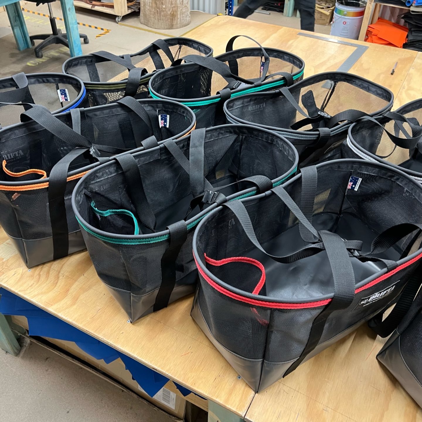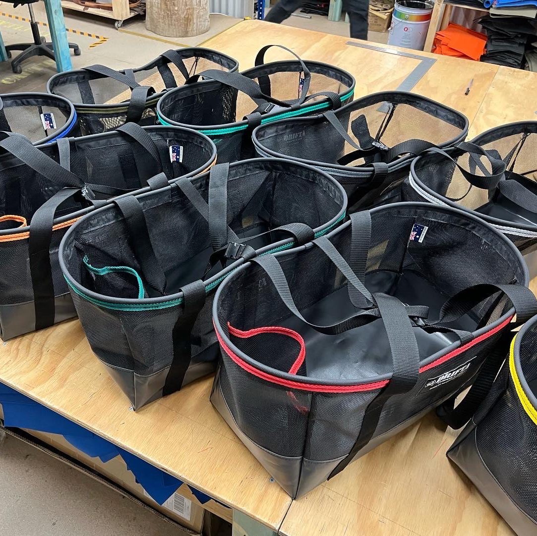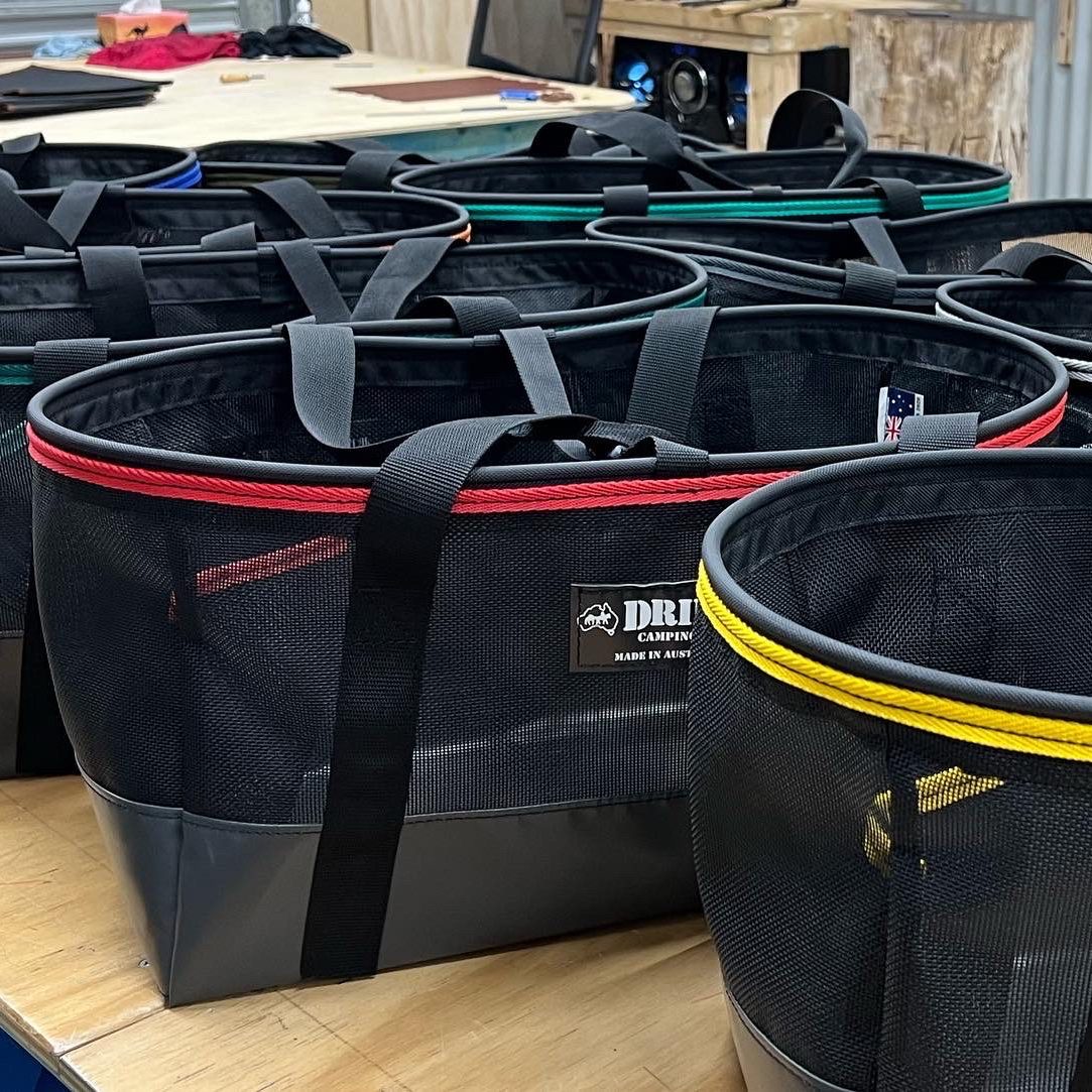 Can be used on the beach carry all etc. PVC base. Mesh sides. Many different binding colours are available.
