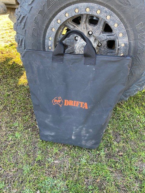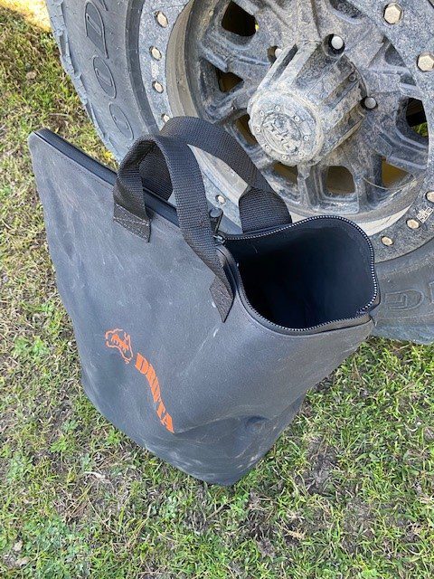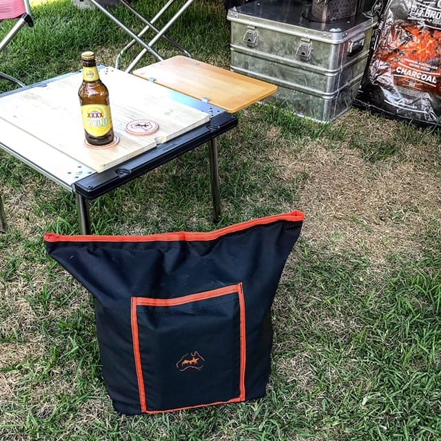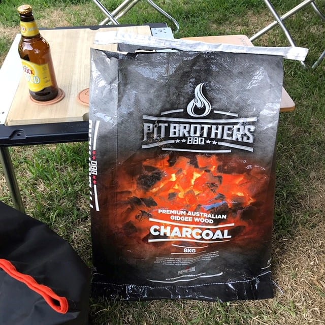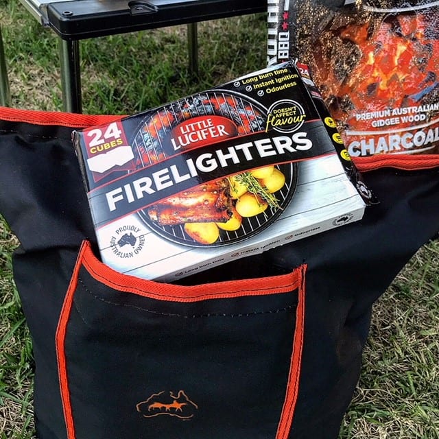 This bag fits the 8kg bag of Pit Brothers charcoal that we are selling. A part of the bag is a front pocket in that you can store fire lighters and your matches or lighters. The bag has Velcro closing on both pockets.