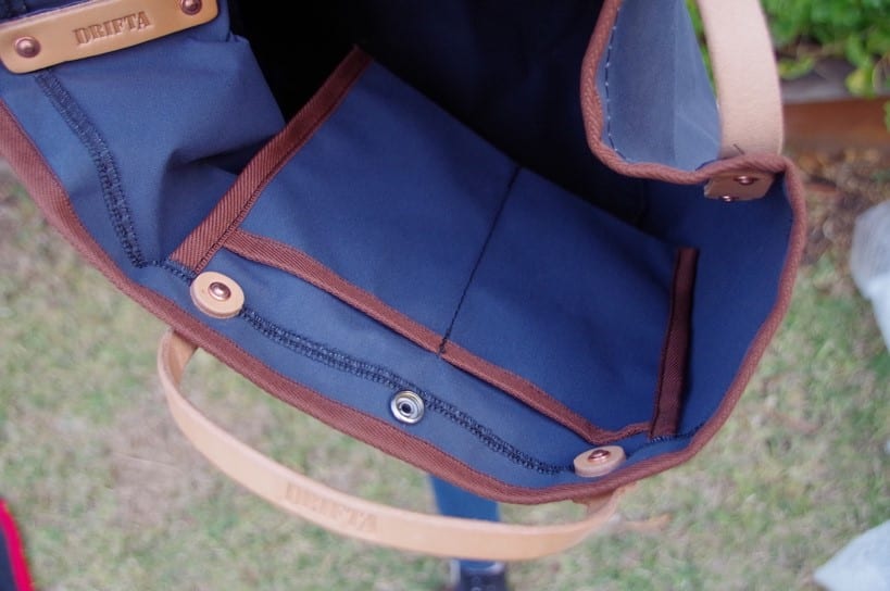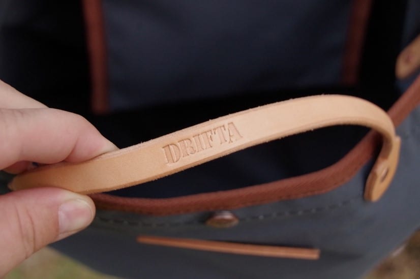 The leather strap makes carrying easy. Drifta press stud lets you close the top. Multiple leather colours are available. On pics is the natural colour.