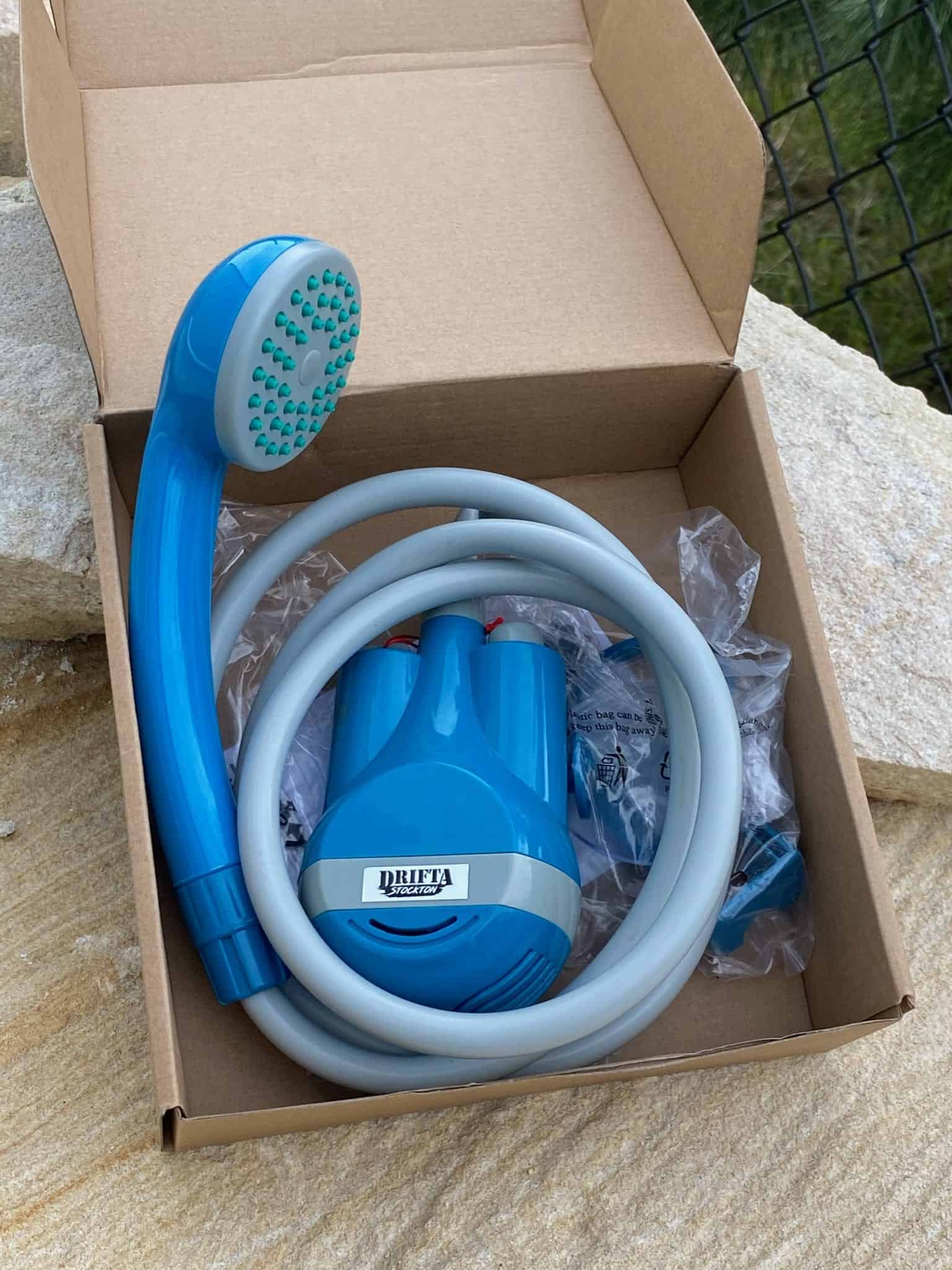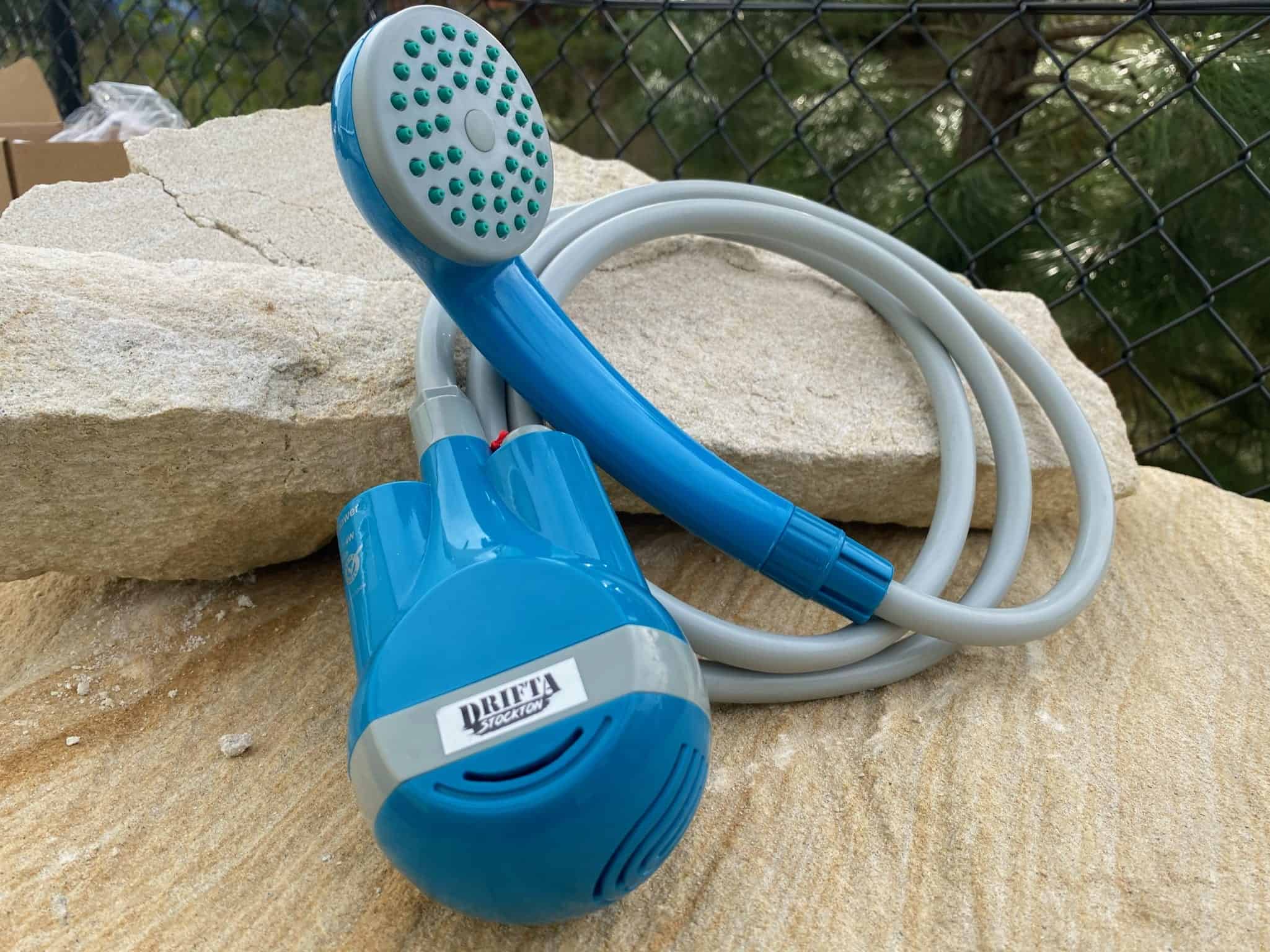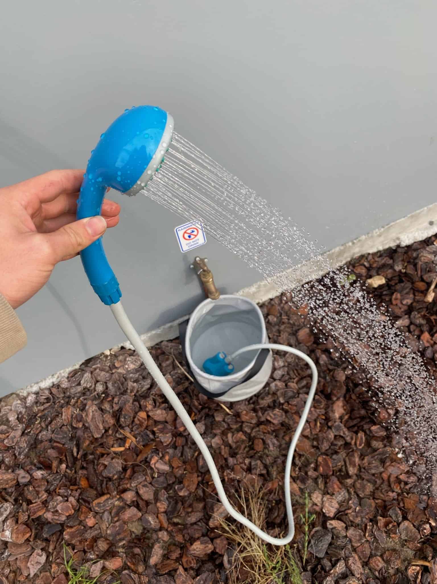 Camp shower for the road that is powered by battery. Perfect for camping, caravans, 4WDs.