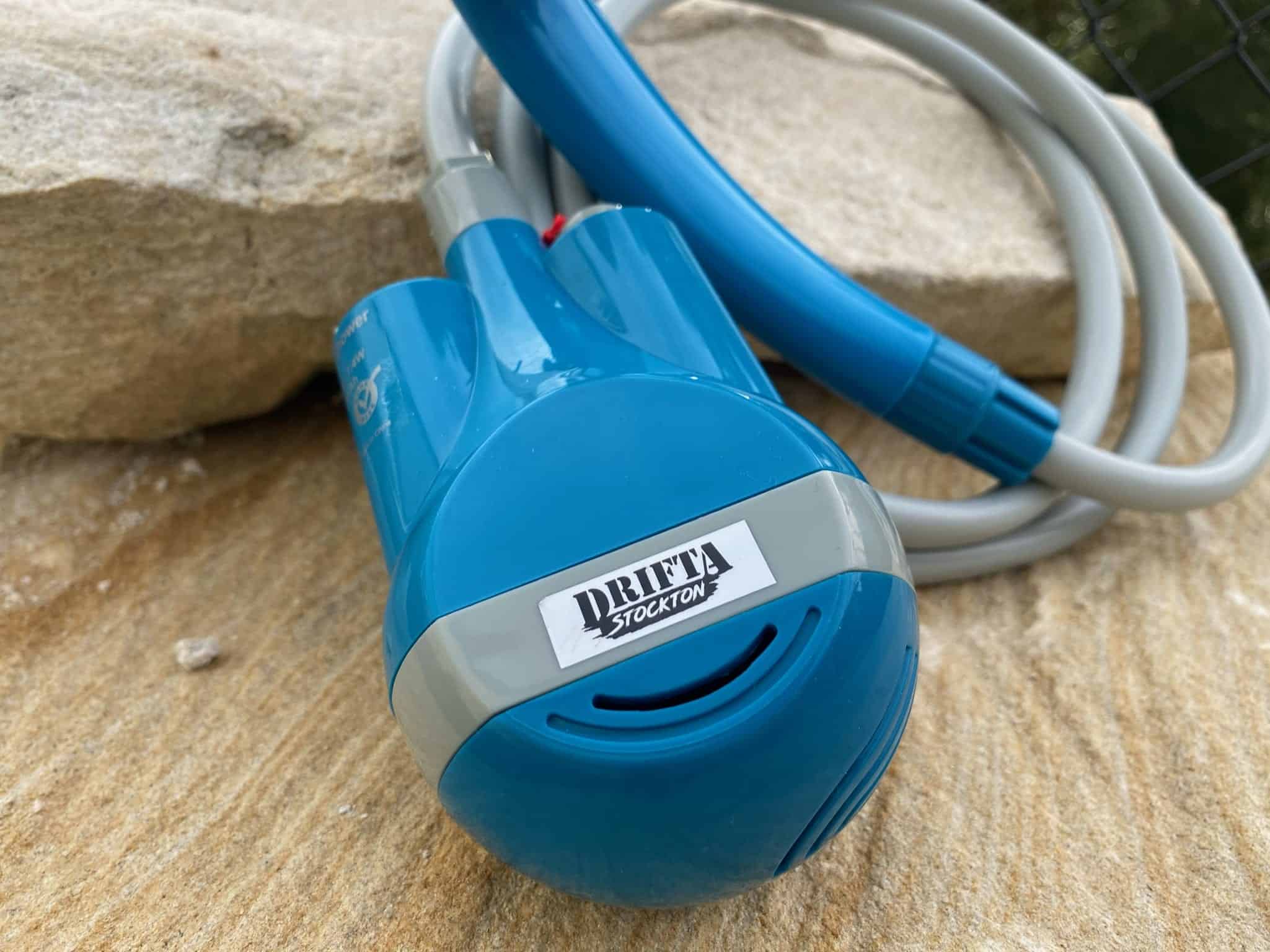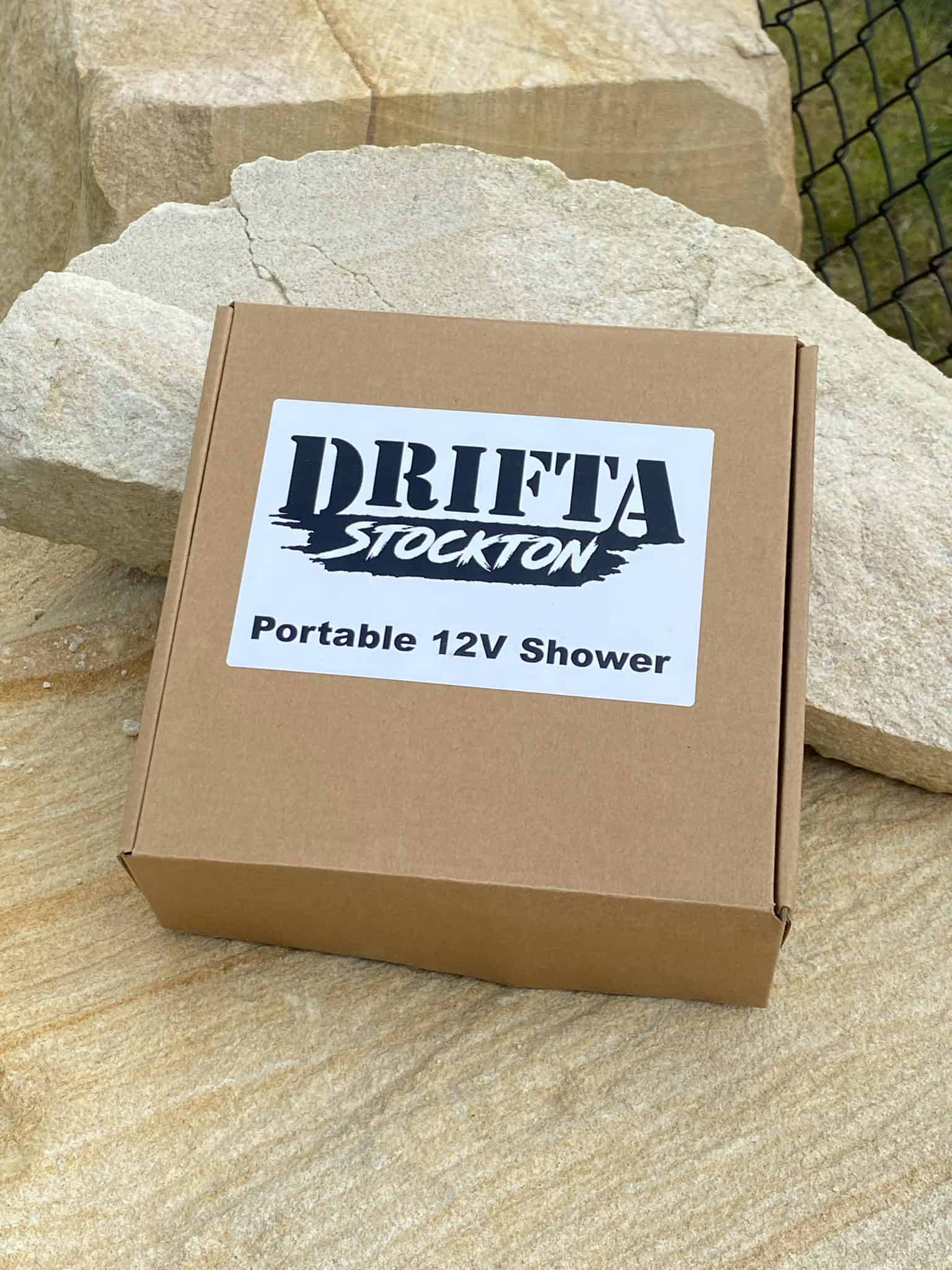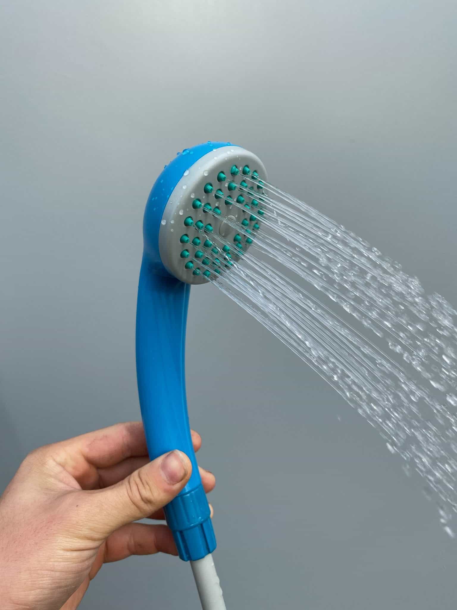 Camp shower for the road that is powered by battery. Perfect for camping, caravans, 4WDs.