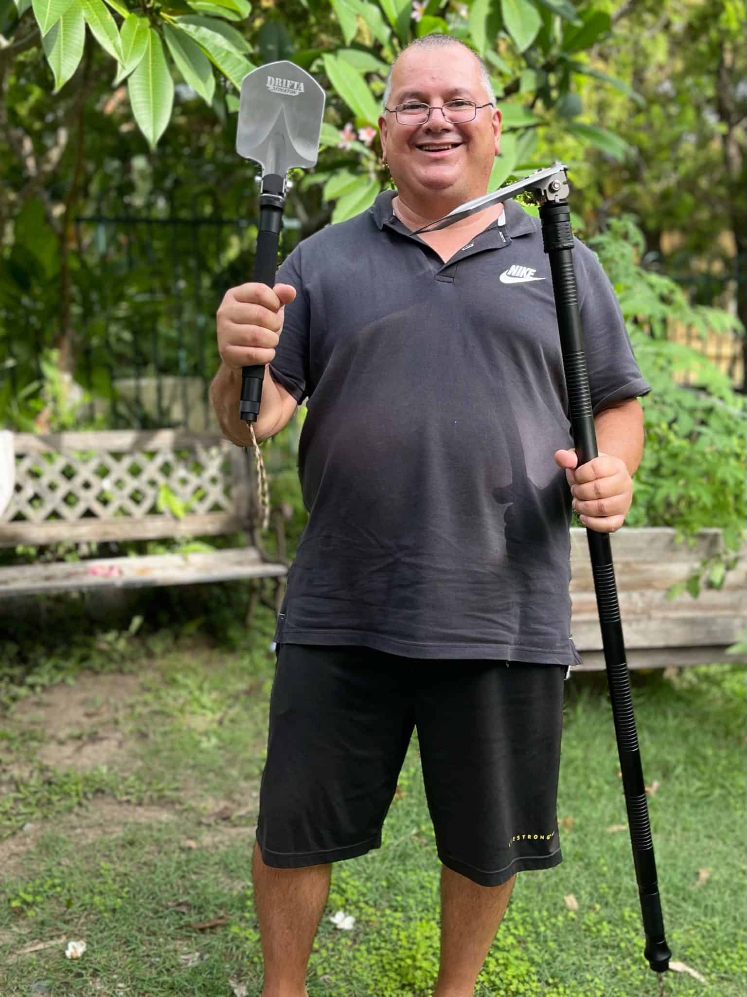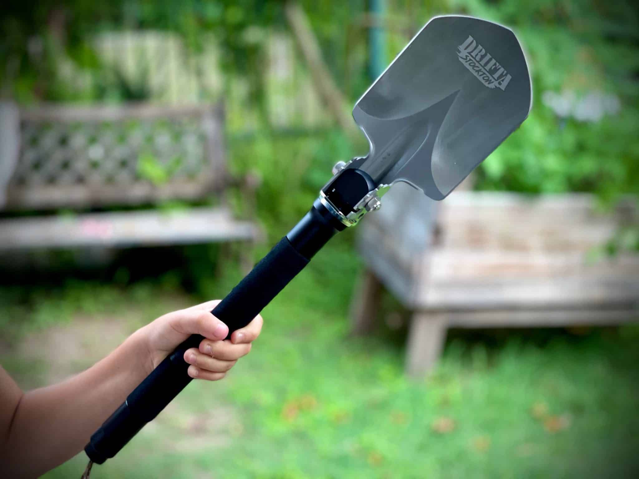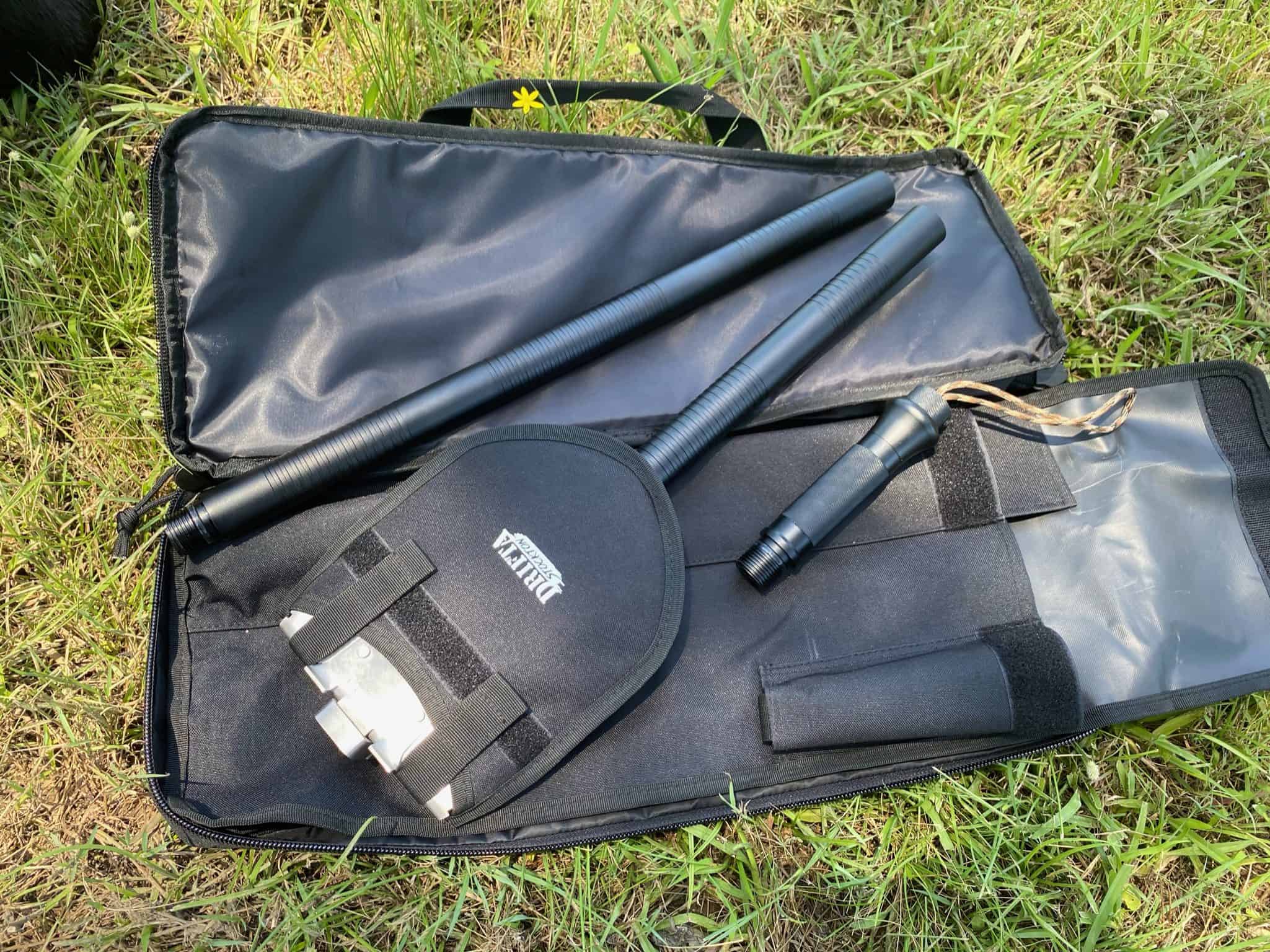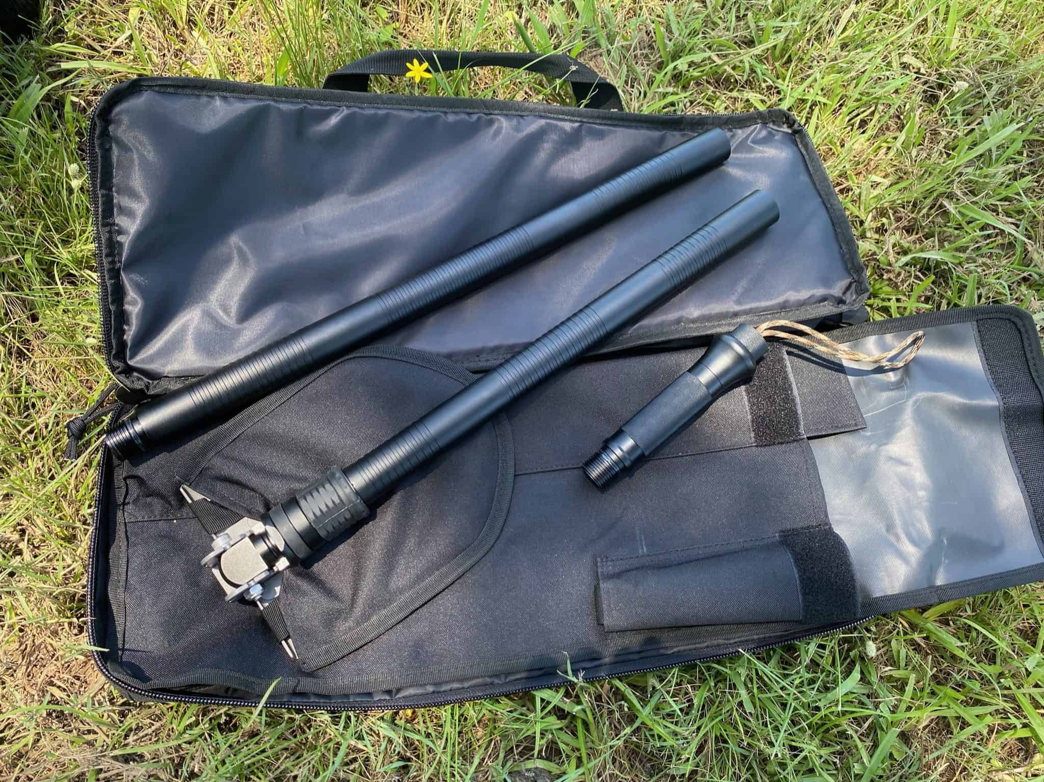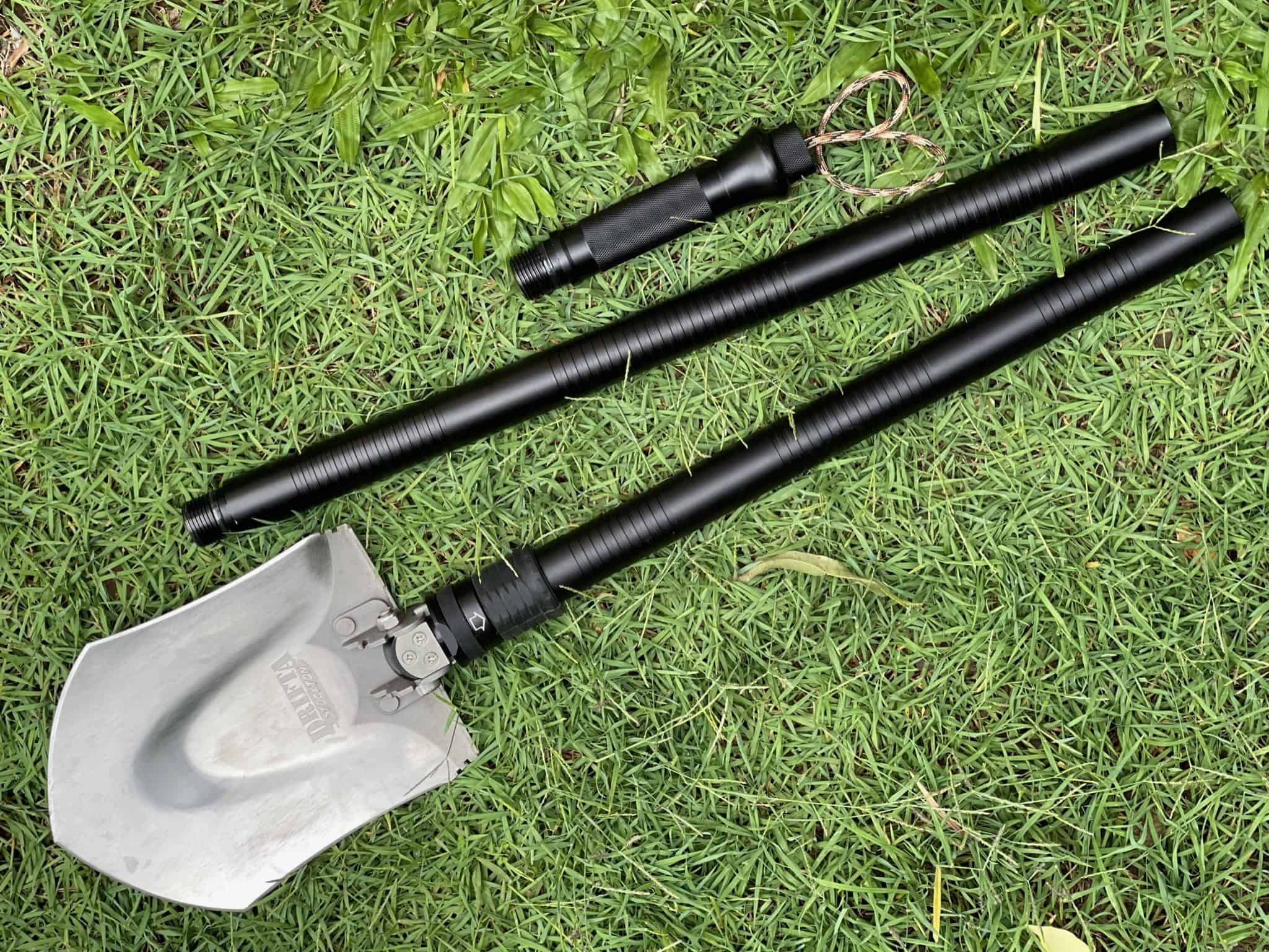 Large shovel – can be taken apart into 3 parts each 2x 500mm + 150mm so once set up the total length with the blade (160mm wide, 200mm long) is 1350mm.