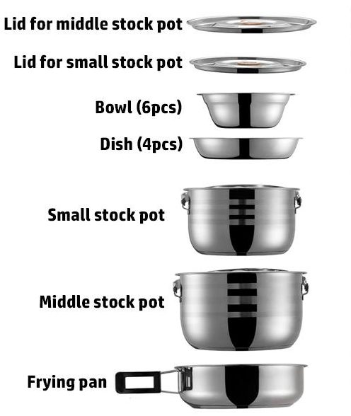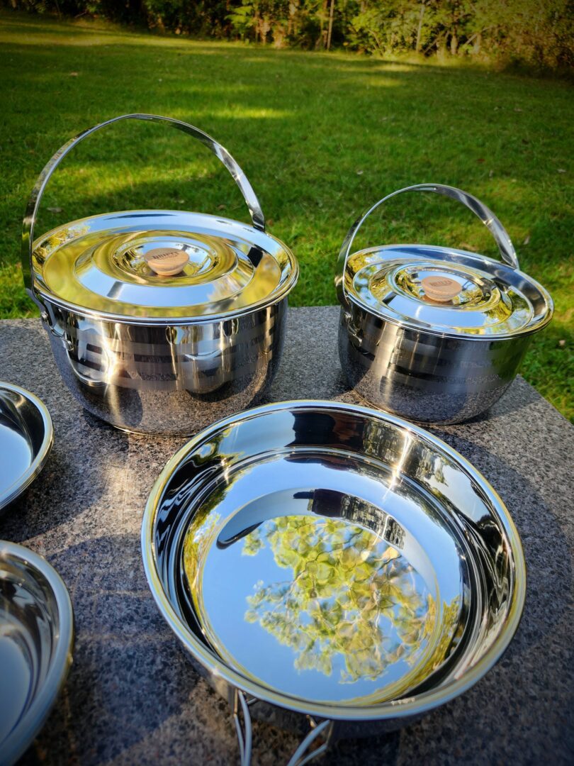 A full set of stainless steel camping cookware.