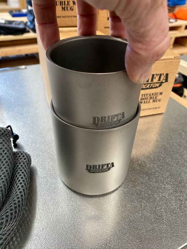 Drifta Stockton titanium double skin mugs are very only 100gr. They keep your drinks warm/cold thanks to the to layers.