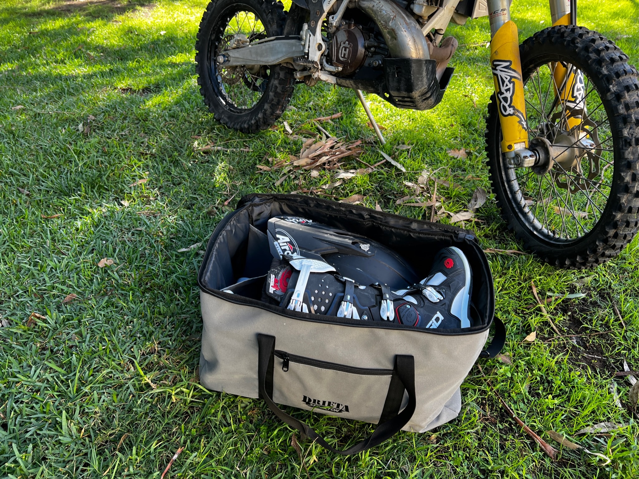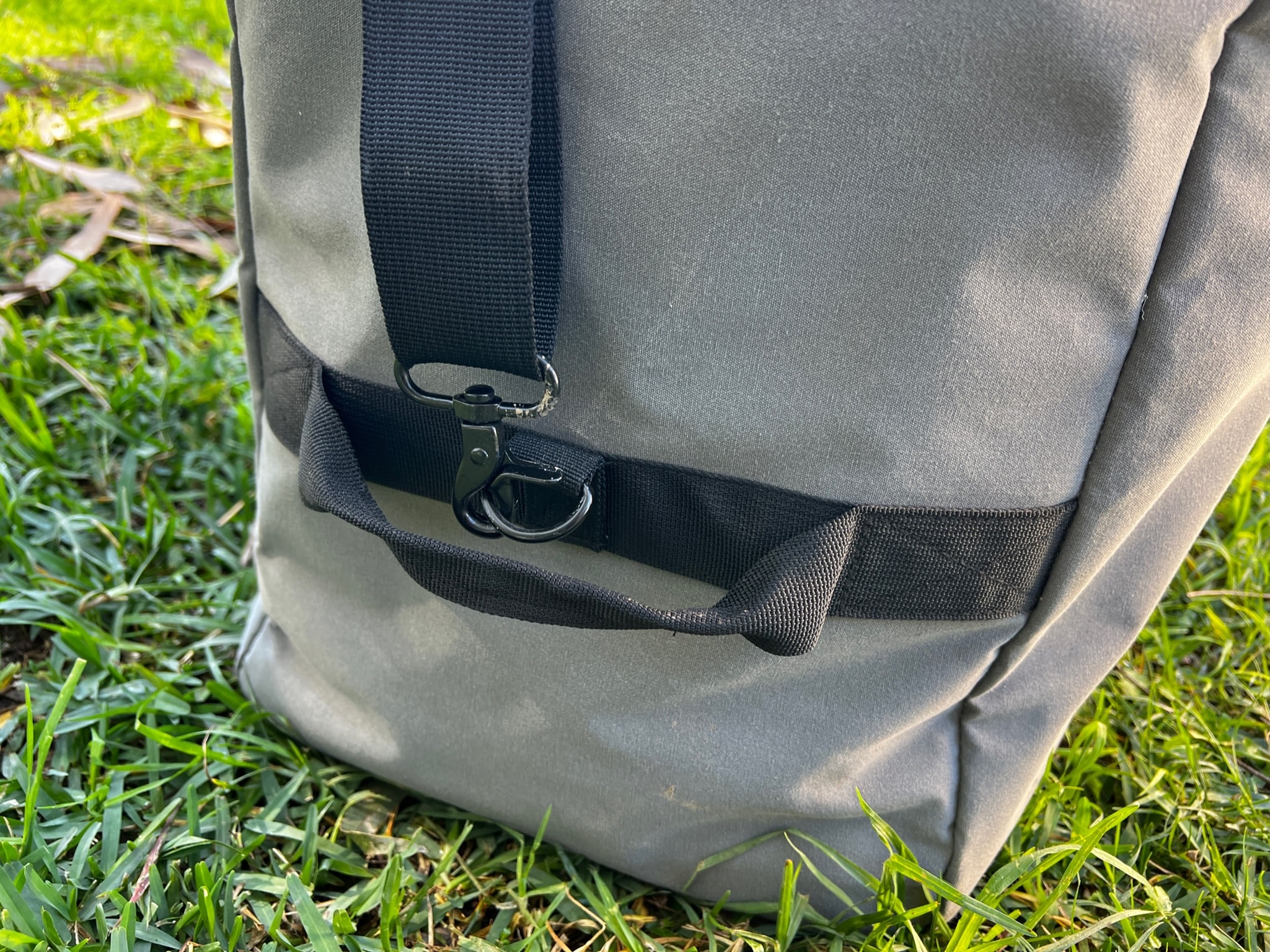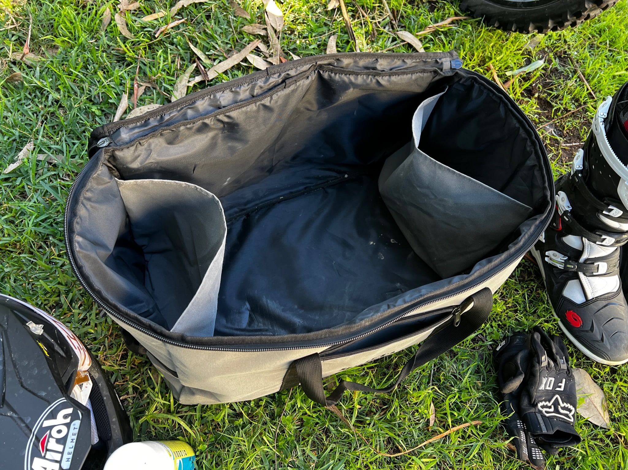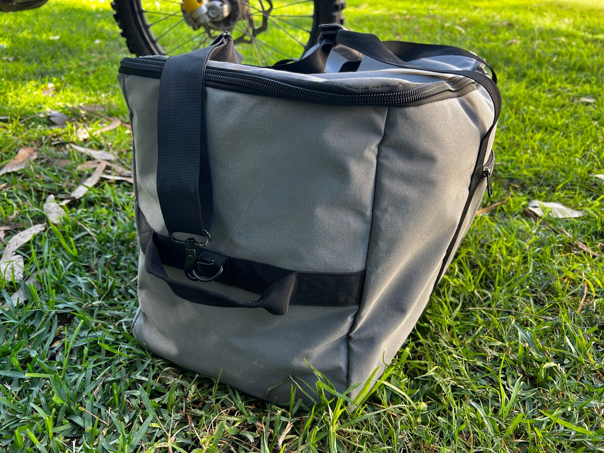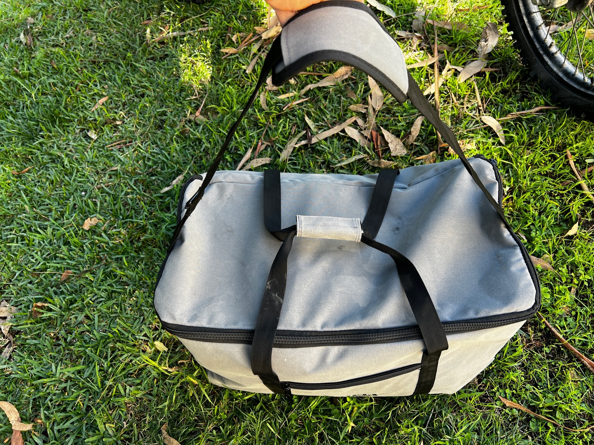 Great bag for the weekend trip. Organize your gear. Two internal side pockets and one zip in the front for your smaller gear. One shoulder strap that can be clipped on/off. and two carry handles that can be connected via velcro plus two side handles that help to lift it up into the back of the vehicle for example.