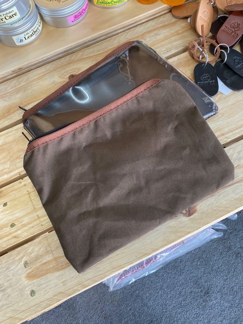 New Wax Con flat bag, made from original Drizabone material , unwaxed. 100 % cotton, very soft , options for clear front, great bag for travelling , store passport etc . another beautiful bag by our Drifta bag ladies